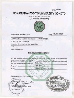 Abdullahi Aminu Al-Ameen has become the first student to graduate with first class honour in the department of Geology, faculty of science; Usmanu Danfodiyo University Sokoto since the inception of the department in 2013
