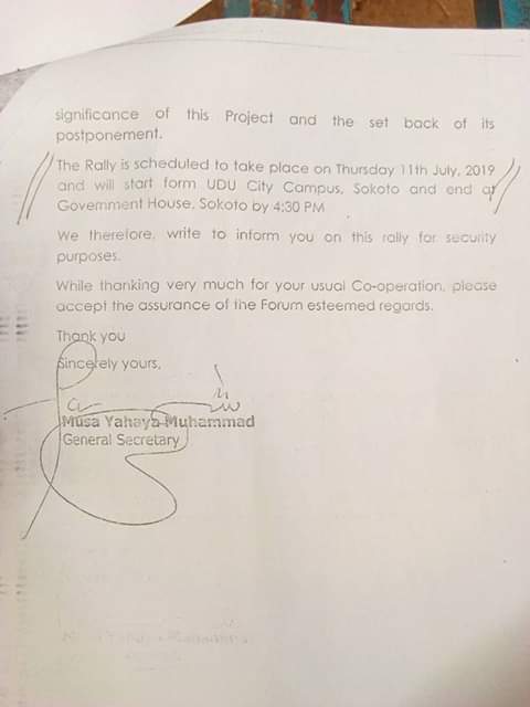 3. The letter of acknowledgement written by the organization to the Nigeria Security And Civil Defence Corps, Sokoto Command revealed that the rally was organized by the Sokoto State Patriotic Forum and Sokoto State Patriotic Forum has not connection with Usmanu Danfodiyo University