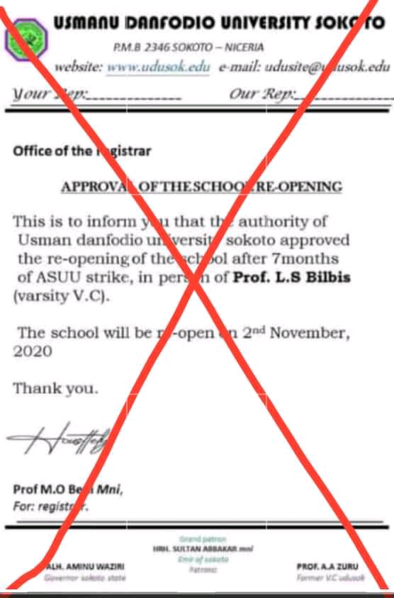 A Viral post which claimed that the Vice-Chancellor of Usmanu Danfodiyo University Sokoto, Prof. LS Bilbis has ordered the reopening of school on November 2nd, 2020 after 7 months of ASUU strike is making round on students’ social media groups.