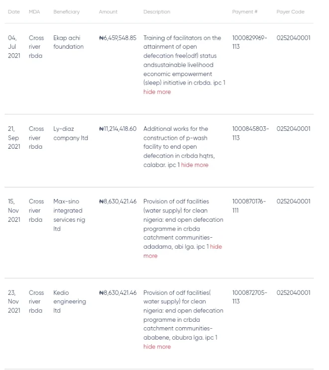 In 2021, N3.4 billion (N3,493,481,037) was also spent on tackling open defecation. The spending began in July when N6,459,548.85 was paid to Ekpa Achi Foundation through the Cross River Basin Development Authority. The payment was made for the training of facilitators on the attainment of open defecation free (ODF) status and sustainable livelihood and economic empowerment initiative in Cross River State.