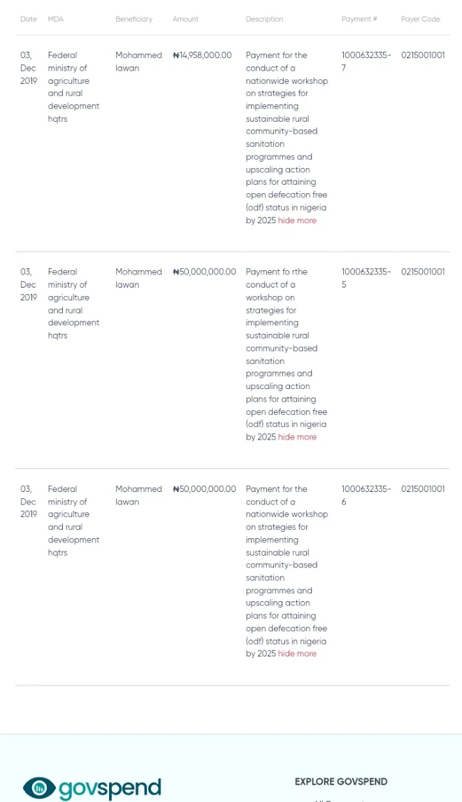 In December 2019, the sum of N11,495,800,000 had been released to one Mohammed Lawan (as a beneficiary) for the conduct of a nationwide workshop on strategies for implementing sustainable rural community-based sanitation programmes and upscaling action plans for attaining open defecation-free status in Nigeria by 2025.